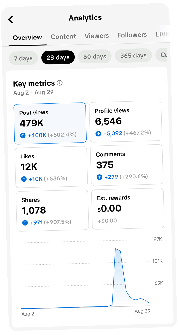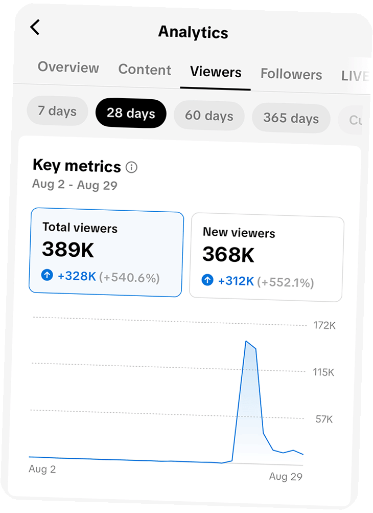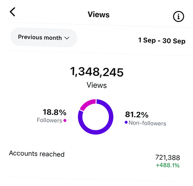 Dadurch, dass wir auf möglichst vielen Social Media Plattformen gleichzeitig deinen Content veröffentlichen, ist es sehr wahrscheinlich, dass wir auch relativ schnell erste “Ausreißer” erzielen. Das sind Inhalte, die 10x oder 100x so viel Reichweite bekommen, als gewöhnlich. Diese viralen “Hits” sorgen dafür, dass auch all deine anderen Inhalte mehr Aufmerksamkeit bekommen.